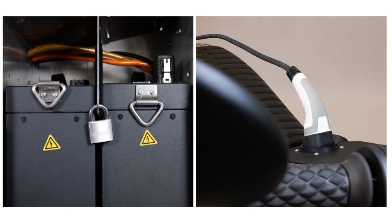 Equipped with a 3.3 kW Charge Tank, the Wildfire allows charging at any standard charging station, wallbox, or regular socket, with a full charge taking just 1.5 hours per battery. For faster charging, the mobile 6.6 kW charger can halve this time, recharging up to 150 km per hour. Each Wildfire model comes with one battery, but an additional battery can be added to double the range, allowing up to 250 km on a single charge. The Type 2 charging cable can be conveniently stored in the 5-liter compartment under the seat, enhancing practicality and convenience for riders.