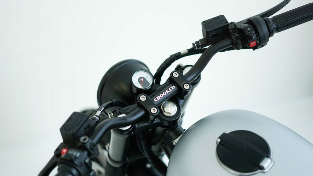 Further enhancements were made to the custom bike, with high-quality components being a key focus. Black rims fitted with Continental TKC 80 tires were chosen to complement the bike’s aesthetic. The team also installed a sleek Bates-style LED headlight featuring Motogadget blaze turn signals, and a Supernova LED brake/rear light to complete the look.