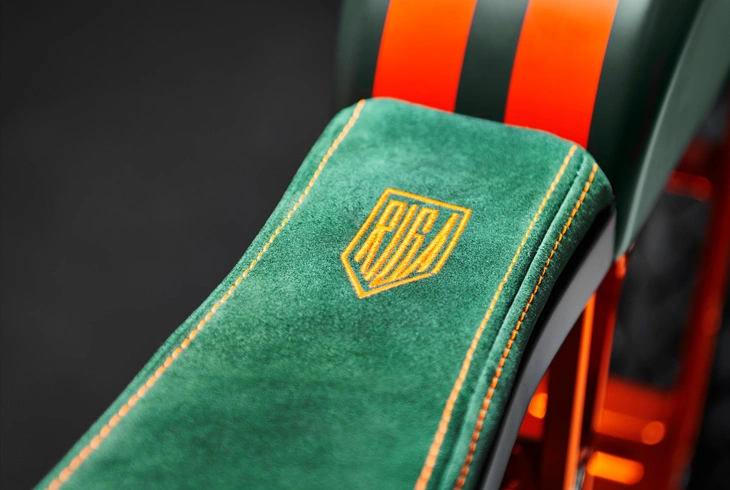 Riders are supported by a leather seat, which has contrast stitching and Riga branding for an upmarket appearance. While hydraulic disc brakes push the ground down, large, knobby tires grab it. Additionally, the exposed rear suspension is awesome.